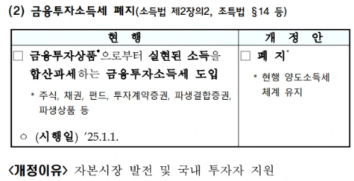 그런 상황에서 이번에 발표된 2024년 세법개정안은 '금융투자소득세 폐지'를 확실하게 내걸었습니다.