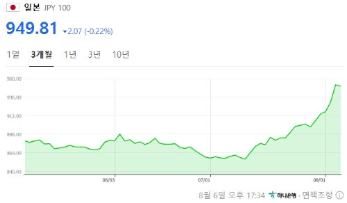 800원대 후반을 유지하던 엔-원화 환율은 금리인상 직후 엄청난 속도로 튀어 오르기 시작하였습니다. 겨우 1주일도 지나지 않은 8월 5일, 단숨에 950원대까지 오른 것입니다.