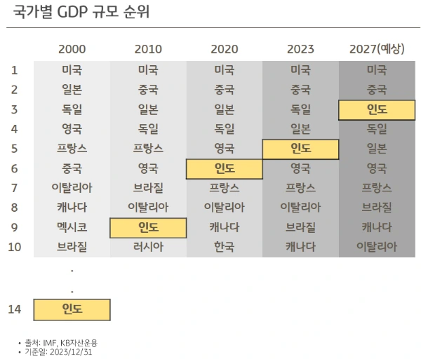 여전히 현재진행형인 높은 성장률을 바탕으로 인도 경제는 2027년에는 세계 3위 수준에 이르게 될 것이라 예상되는 중입니다. 미국과 중국 그다음이 된다는 것이죠.