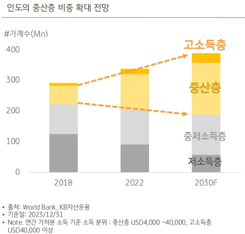탄탄한 중산층은 커지는 경제규모와 내수시장을 뒷받침할 수 있는 중요한 요소 중 하나입니다. 지금의 추세는 인도의 내수시장도 빠르게 커질 수 있다는 사실을 보여줍니다.