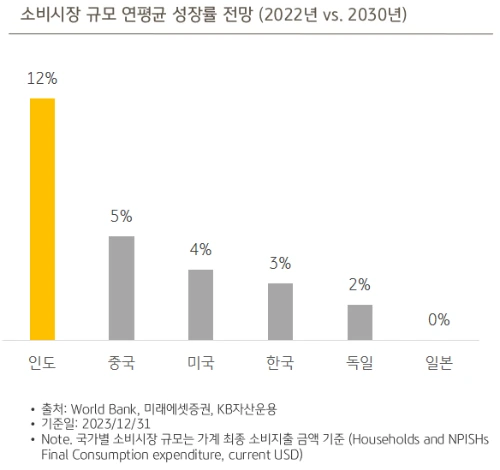 아니나 다를까, 인도의 소비시장 규모는 2030년까지 연평균 12%나 커질 것으로 예상되고 있습니다.