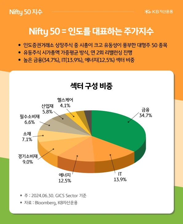 인도의 대표 주가지수인 Nifty 50에 투자하는 'KB스타 인도 Nifty 50 인덱스' 펀드입니다.