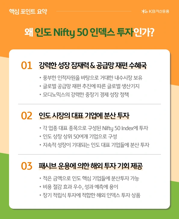 즉, 'KB스타 인도 Nifty 50 인덱스' 펀드 투자를 통해 인도 시장에 효율적인 투자를 할 수 있는 것입니다.