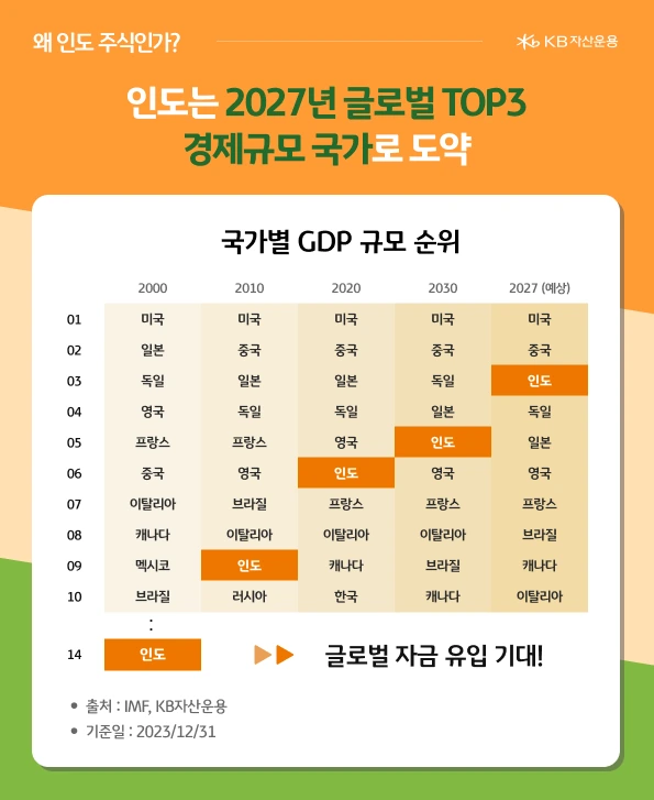 인도는 시간이 흐를수록 경제규모가 커져왔습니다. 2023년에는 무려 세계 5위 GDP 규모를 가지게 되었으며, 2027년에 이르러서는 미국과 중국에 이어 3위를 하게 될 것으로 예상되고 있습니다.