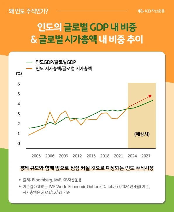 글로벌 GDP 대비 인도의 GDP 비중, 그리고 글로벌 시가총액 대비 인도 시가총액 비중은 거의 비슷한 움직임을 보여왔고, 앞으로도 그럴 것이라 예상되는 중입니다.