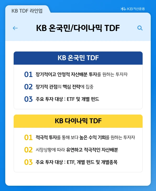 우선 크게 두 종류의 TDF가 존재합니다. 각각 'KB 온국민 TDF'와 'KB 다이나믹 TDF'입니다.