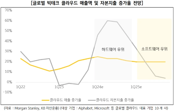 Microsoft, Alphabet 등 글로벌 대표 클라우드 기업들 또한 2025년도에 견조한 클라우드 소프트웨어 매출 성장세(+20%대)가 유지되고, AI 인프라/반도체 지출(Capex) 증가세는 둔화될 것으로 전망되고 있습니다.