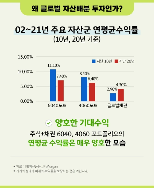 6040 포트폴리오는 7.4%의 연평균 수익률, 4060 포트폴리오는 6.4%의 수익률을 기록한 것입니다. (*2002~2021기준)