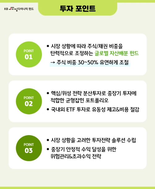 'KB 디딤 다이나믹 자산배분' 펀드의 주요 특징들은 앞서 알아본 투자 포인트의 연장선입니다.