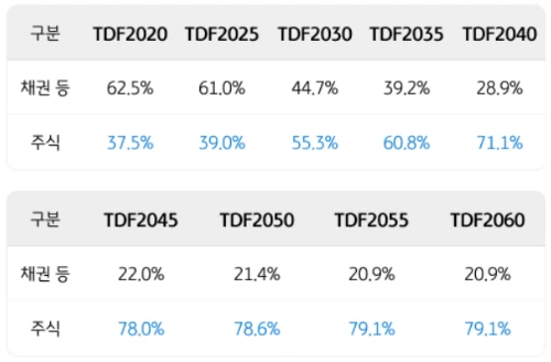 다시 정리하면 투자자의 생애주기를 고려해서 가격 상승에 몇 %, 정기적인 수익에 몇 %씩 나누어 투자하는 상품이 TDF인 것입니다.