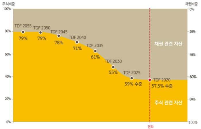 TDF는 투자자의 생애주기를 고려해 위험자산과 안전자산의 비중을 조정해 줍니다.