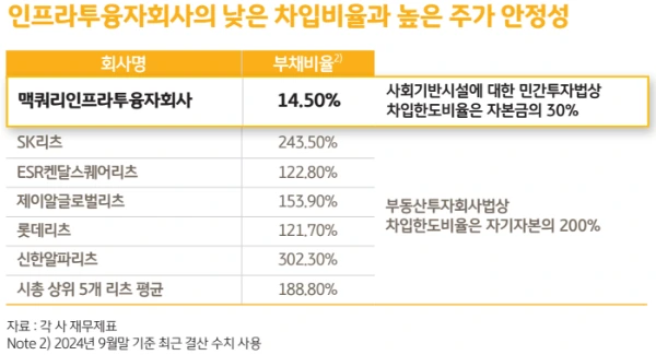 → 국내 인프라 펀드는 민간투자법의 적용을 받고, 리츠는 부동산투자법의 적용을 받습니다. 리츠의 경우 자금 차입 한도가 200%인데 반해 인프라 펀드의 경우 30%에 불과합니다.