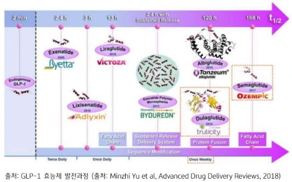 바이에타 이후 다수의 빅파마들은 반감기가 증가된 GLP-1 수용체 효능제 개발 연구를 지속합니다.