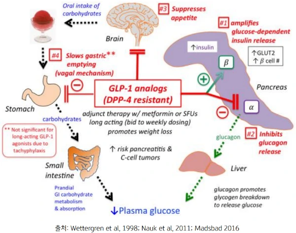 바로 그 인슐린을 췌장의 베타 세포가 분비하고, 이를 촉진하는 게 GLP-1입니다. GLP-1은 여기에 추가로 인슐린과 반대 작용을 하는 글루카곤을 억제하는 기능도 가지고 있습니다.