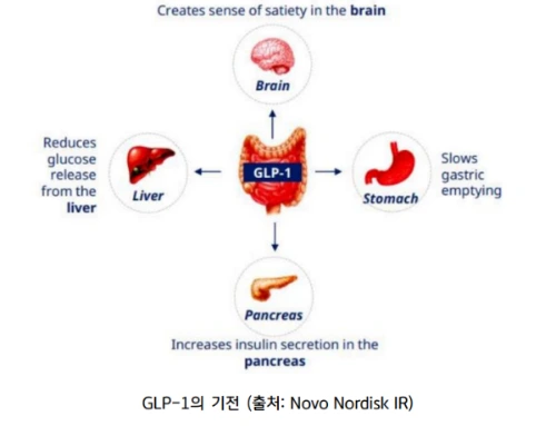 췌장의 beta 세포 및 인슐린 관련 기전에 주목하여 GLP-1 수용체 효능제를 당뇨 치료제로 개발하였는데, 연구자들은 이번엔 GLP-1이 뇌에서 식욕을 억제하고, 위장관 운동을 느리게 하여 포만감이 사라지지 않도록 하는 기능에 대해 주목하였습니다.