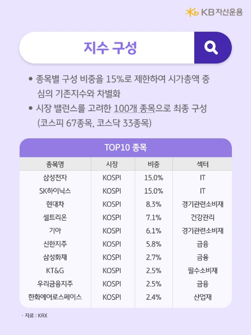 현재 기준으로 총 100개의 기업이 지수를 구성하고 있으며, 이중 67개가 코스피 상장 종목, 나머지 33%가 코스닥 상장 기업입니다.