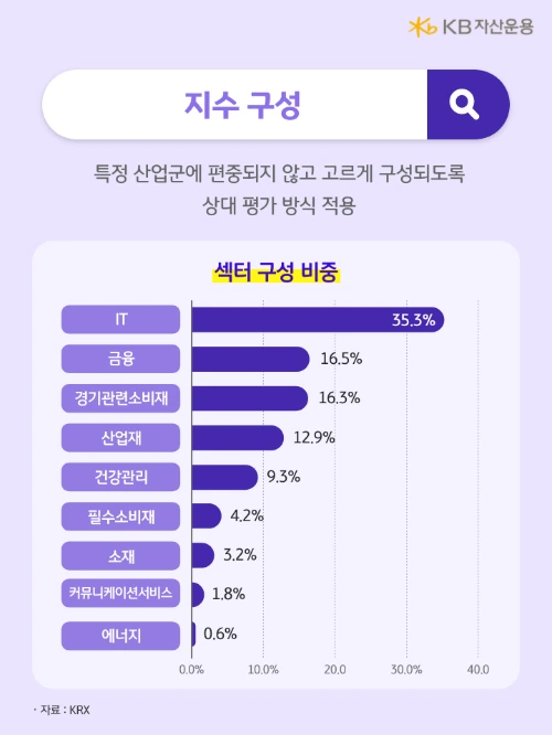 '코리아 밸류업 지수'는 특정 산업군에 편중되지 않고 고르게 구성되었습니다. 그리고 상대평가 방식을 적용하였죠.