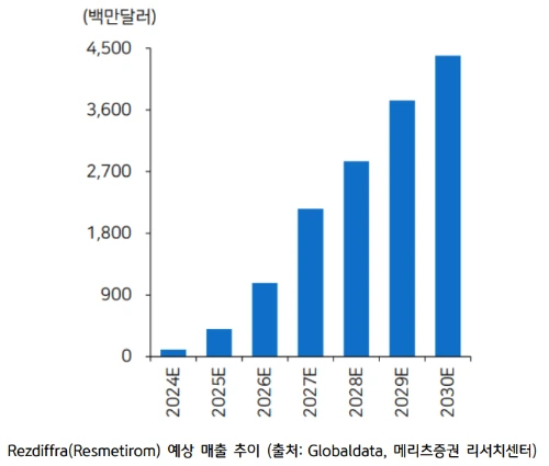 명확한 치료제가 없기에 조금 부족한 효과에도 승인이 이뤄졌습니다. 그럼에도 불구하고 레스메티롬은 매 분기 놀라운 매출 성장을 보여주며 MASH 치료제 시장의 성장성이 크다는 것을 몸소 증명하고 있습니다.