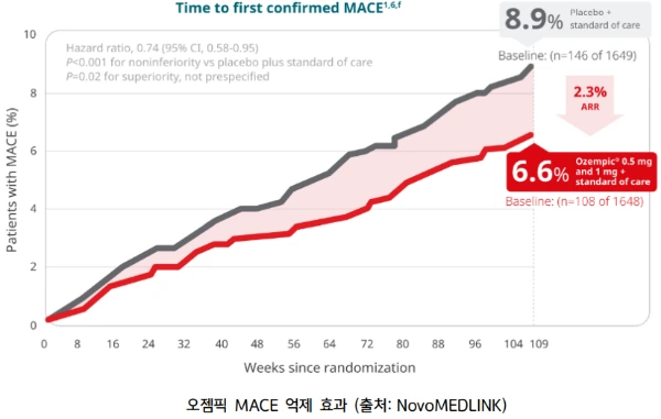 노보노디스크는 오젬픽으로, 당뇨, 비만, MASH에 이어 심혈관 질환 체료제로 개발을 진행 중인데, SELECT 임상시험을 통해 주요 심혈관계 사건(MACE)의 20% 이상 개선 효과를 기록하며, 다시 한번 시장을 놀라게 했습니다. (MACE는 심혈관 질환으로 인한 사망, 심근경색, 뇌졸중 등이 포함됩니다.)
