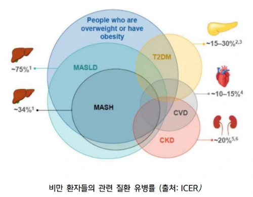 비만치료제로 GLP-1 수용체 효능제가 개발된 만큼, 비만과 연관성이 높은 MASH로도 적응증 영역이 확장된 것인데, MASH의 전단계인 MASL까지 포함한 전체 MASLD의 환자 규모는 미국 전체 성인의 20% 이릅니다.