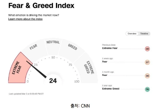 현재는 ‘극단적 공포’ 구간에 들어와 있는데요. 현시점(2025년 3월 3일 현지시각) 왜 사람들의 심리가 위축되어 있을까요?