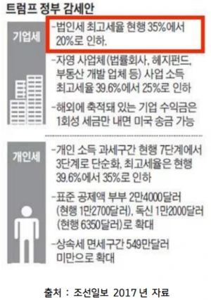 그 이유 중 하나로 "법인세"를 논하지 않을 수 없는데요. 트럼프는 예전 1기 때부터 법인세 인하를 파격적으로 제시했었습니다.