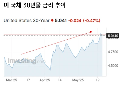 미 국채 금리 움직임이 심상치 않습니다. 미 30년물 금리가 다시 5%를 돌파하며 장기채 투자자들의 우려가 커지고 있는데요
