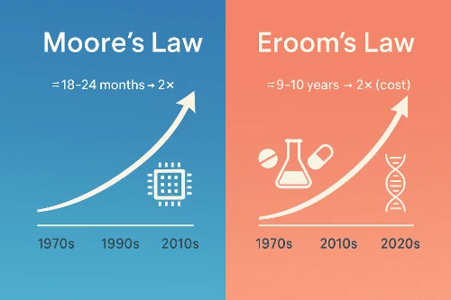 신약개발 분야에서는 MOORE를 역순으로 쓴 EROOM의 법칙이 있는데, 이는 신약 개발 비용이 약 10년마다 두 배로 증가한다는 법칙입니다.