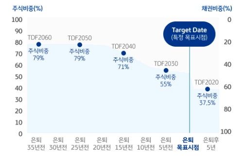 즉, 내가 신경쓰지 않아도 은퇴까지 자산배분을 자동으로 조절해주는 펀드입니다.