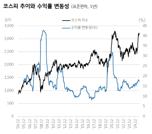 예를 들어, 최근 1년간 코스피 수익률의 변동성(표준편차)은 17.4%였습니다.
