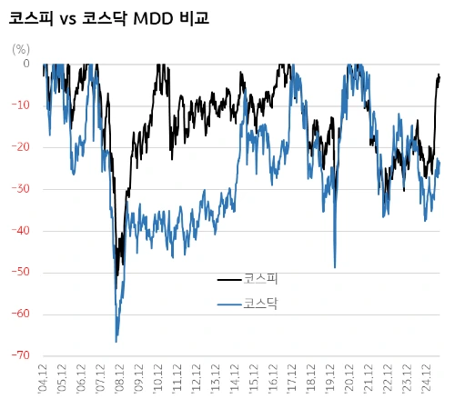 코스피와 코스닥의 지난 20년간 MDD를 살펴보면 흥미로운 결과가 나옵니다.