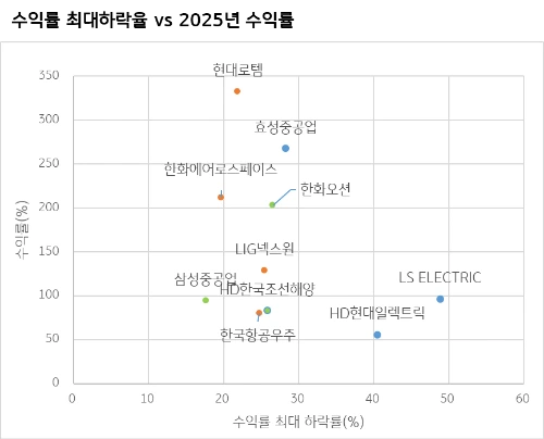 2025년 9월 12일까지의 데이터를 보면, 전반적으로 수익률 최대 하락폭이 작았던 종목일수록 이후 수익률이 더 높게 나타났습니다.