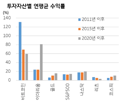 전통자산 중 어느 것도 따라가기 힘든 수준의 수익률이죠.