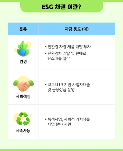 대표적으로 친환경차 개발이나 탄소배출 절감 같은 환경 사업이나, 코로나19 지원 대출과 같은 사회적 금융상품이 있습니다.