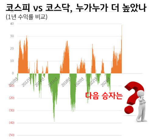 아래 차트는 코스피와 코스닥에 1년간 투자했을 때의 상대수익률을 비교한 것입니다.