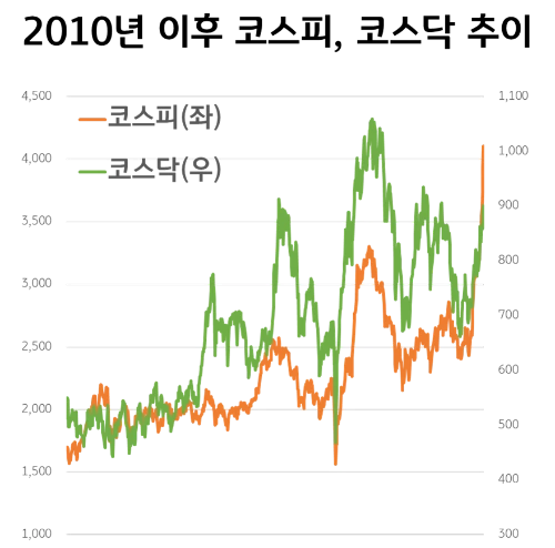 그리고 지금은 코스피 시장이 압도적으로 독주하는 시장입니다.