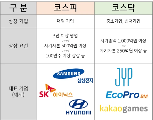 반면 코스닥은 바이오, 로봇 등 신산업 중심의 중소형주, 테마주가 밀집해 성장성이 주요 투자 기준이 되는 시장입니다. 미래 가능성으로 승부하는 기업들이 모여 있다고 보시면 됩니다.