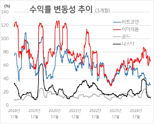차트를 보면, 비트코인과 이더리움의 변동성은 여전히 나스닥이나 금 같은 전통자산에 비해 높은 수준입니다.