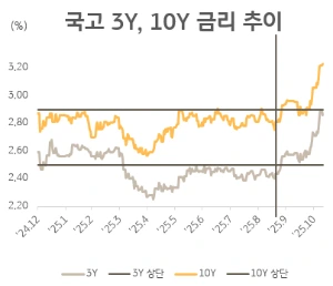 국고 3년물은 2.5%, 10년물은 2.9% 수준이 상단으로 인식되던 시점이 있었지만, 2025년 11월 10일 기준으로 각각 2.862%, 3.230%를 기록했습니다.