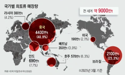 ◆ 희토류는 첨단 산업의 필수 소재이지만, 중국이 채굴부터 정제ㆍ가공까지 전 과정에서 압도적인 비중을 차지하며 미·중 패권 전쟁의 핵심 무기가 되었습니다.