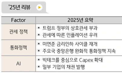 미 연준(Fed)의 추가 금리 인하(내년 2~3회 예상)와 재정 확대 정책이 증시에 긍정적으로 작용할 전망입니다.