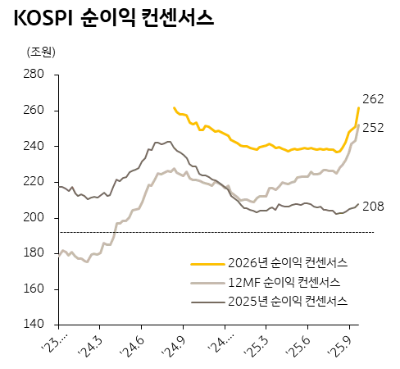 삼성전자(90~100조 원)와 SK하이닉스(80~90조 원)의 합산 영업이익만 약 170~190조 원에 달할 것으로 보이며, 코스피 전체 영업이익은 전년 대비 40% 이상 증가할 전망입니다.