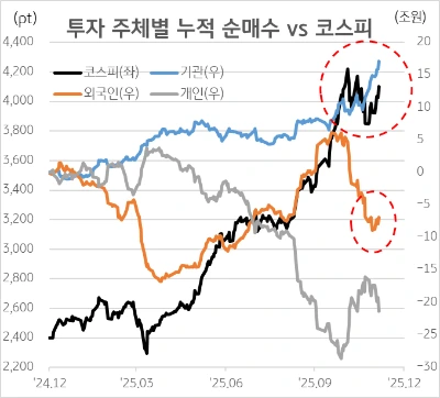◆ 최근 코스피의 급등락은 단순한 변동성이 아니라, 외국인 수급 변화가 만들어낸 흐름이라는 점에서 주목할 필요가 있습니다.