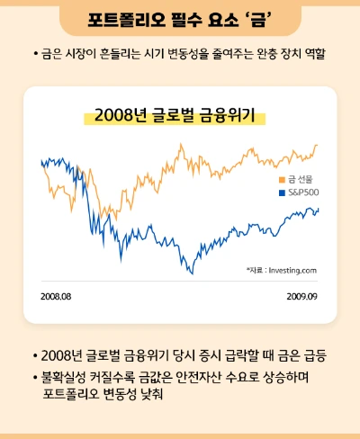 일례로 2008년 글로벌 금융위기처럼 시장이 급락했을 때 금은 다른 자산과 다른 움직임을 보였습니다.