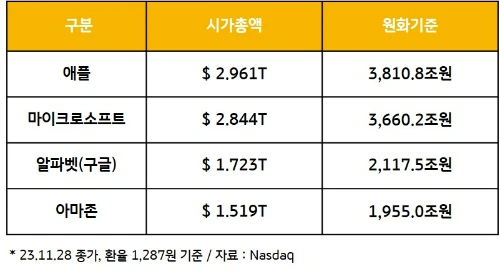 11월 28일 종가 기준 세계 1등 기업인 애플의 시총이 무려 3,810.8조원에 달합니다. 마이크로소프트도 3,660.2조원이라는 거대한 규모를 형성하고 있고, 알파벳도 2,217.5조원이나 되죠.