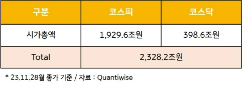 11월 28일 종가 기준, 코스피 전체 시가총액은 약 1,929.6조원, 코스닥이 398.6조원입니다. (자료 : Quntiwise)