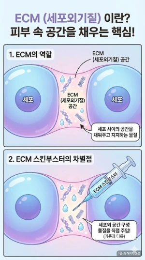 반면 ECM 스킨부스터는 체내 재생효과와 무관하게, 피부 개선을 유도할 수 있는 물질을 직접 주입해주는 형식입니다.