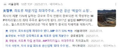 미 국방부, MP 머터리얼스 최대주주 뉴스 헤드라인 (출처:네이버뉴스)