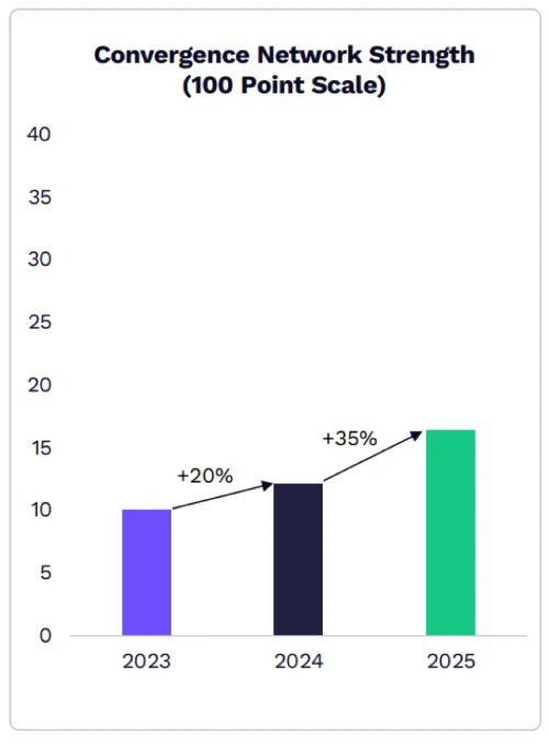 이를 보여주기 위해 '수렴 네트워크 강도'라는 지표를 제시했는데, 기술들이 서로 얼마나 촉진하는지를 수치화한 값이며 2025년 에 35% 증가했다고 밝혔습니다.