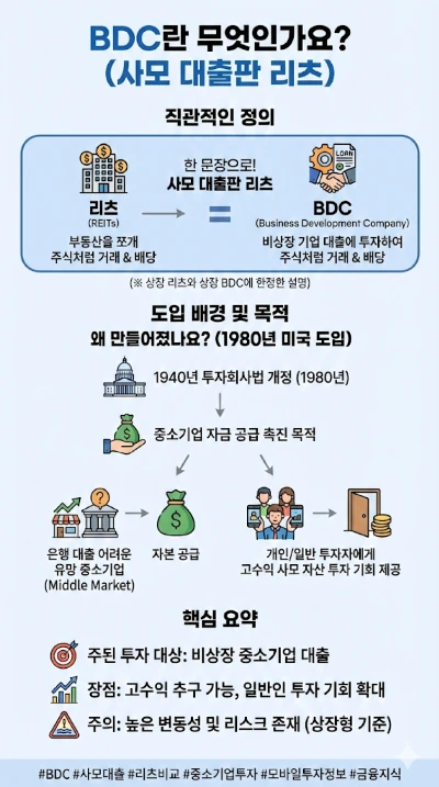 리츠가 부동산 자산을 쪼개 주식처럼 거래하고 배당을 지급한다면, BDC는 비상장 기업 대출에 투자한 자산을 기반으로 주식처럼 거래되며 배당을 지급한다는 점에서 구조적으로 유사합니다.